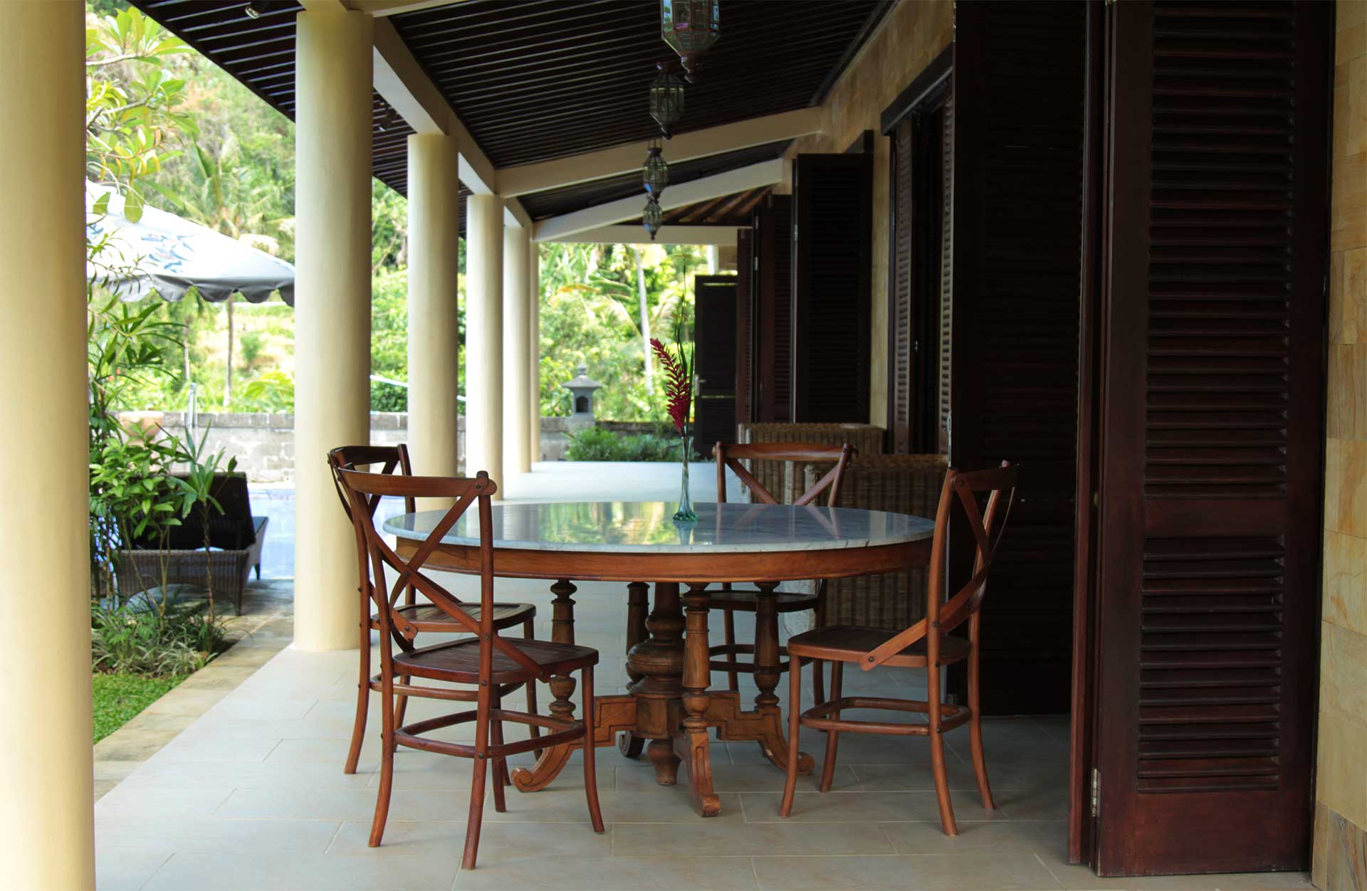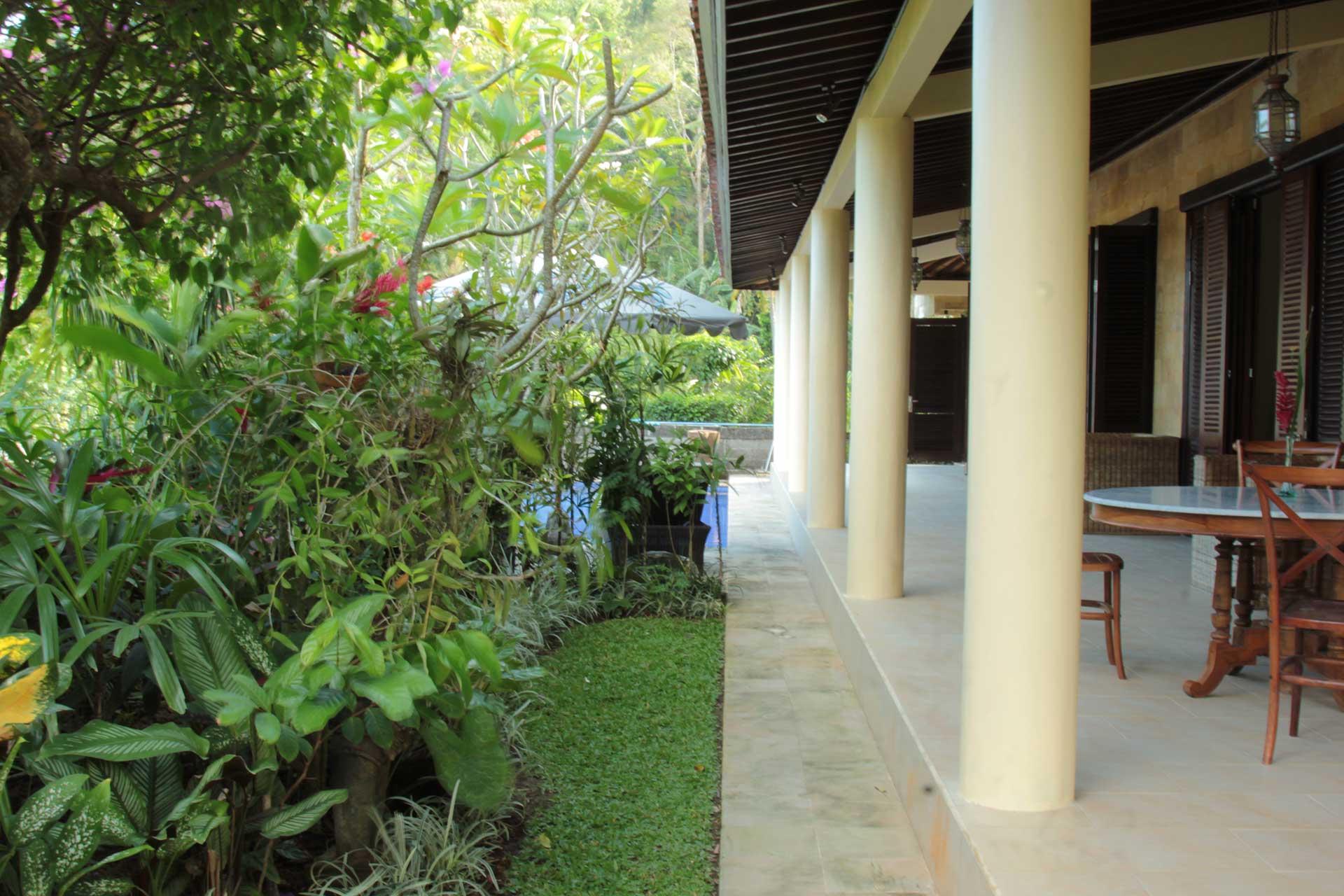The house has a spacious 20 meters wide veranda in front of the villa from where you have a stunning view over the rice fields , the hills and the coconut plantations. Attached to the veranda there is a lovely cobalt blue tiled swimming pool . The tropical garden that surrounds the house is a place of peace and tranquillity and offers from each corner of the garden a great view over the landscape . The garden has a traditional Balinese gate and is bordered by a low stone wall , designed to maximise the view over the rice fields.