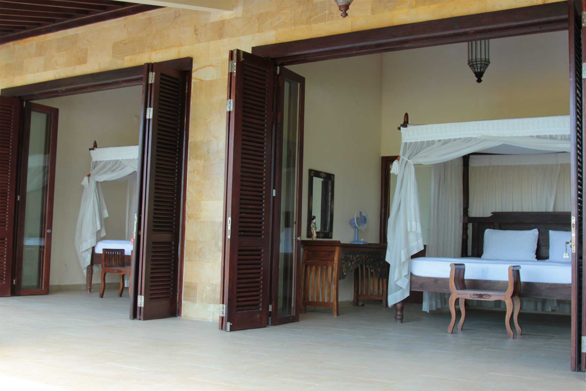 Villa Tirta Guna Bali is located in the Karangasem regency, Mangis subdistrict in the village of Bukit Catu ( Dessa Tirta Guna ) The villa is beautiful situated in the heart of the local rice fields and coconut plantations. The name Tirta Guna means pure / holy water to be used. The ground plan of the villa measures 200 square meters and is surrounded by a beautiful garden. The villa has a spacious living room with a high roof , two 4 x 3.5 meter bedrooms with in each a 2 x1.8 meter four poster bed and a dressing table. The folding doors can be opened wide to ensure a great view over the rice fields. It has a kitchen, a wardrobe room , a inside bathroom with a large marble washing stand with twin marble basins and a toilet .The Balinese outdoor bathroom consist a Black terrazzo bad tube and a shower with hot and cold water. The villa is spacious enough for 4 persons, but if necessary we are able to create place for 2 more persons.